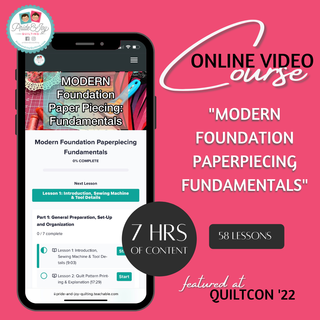 El curso en video en línea de "Modern Foundation Paperpiececing: Fundamentals" contiene 7 horas de contenido, lo que le brinda una clase integral de desarrollo de habilidades dirigida a principiantes en FPP, así como a Quilters que tienen experiencia pero desean mejorar sus habilidades.